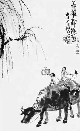 芳草遍地,廣袤原野之中,晚歸的牧童吹奏著短笛,在夕陽和晚風聲中帶來大自然的訊息。飯后閑臥,瀟灑自然,恣意投入自然的懷抱,明月相伴,好夢酣然。再如宋代詩人雷震的《村晚》,亦寫這樣的小牧童: