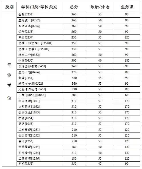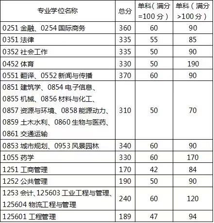 專業學位方面變化較大,有20個專業上漲:工程中的交通運輸上漲80分,工程其他專業、新聞與傳播、圖書情報上漲30分,社會工作、漢語國際教育、工程管理上漲20分,國際商務、體育、藝術上漲15分,金融,應用統計、保險、法律(法學)、應用心理、文物與博物館、臨床醫學、口腔醫學、護理、藥學上漲10分。
