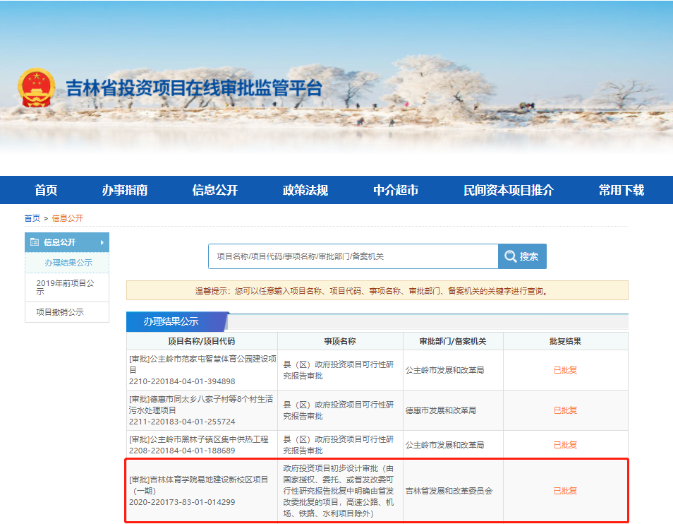 吉林省投資項目在線審批監管平臺近日公示一條消息!就是關于“吉林體育學院易地建設新校區項目(一期)”的批復結果。