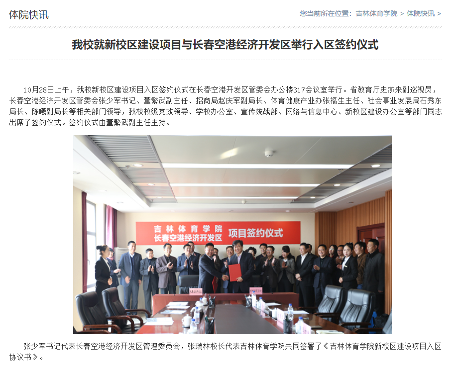 2016年10月28日,吉林體育學院新校區建設項目入區簽約儀式在長春空港開發區管委會辦公樓317會議室舉行。