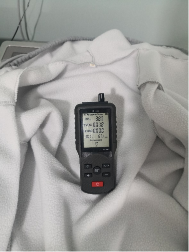 因為三臺測試的合資洗衣機屬于中檔價位產品,太高端的衣物護理功能也沒有,這里只能簡單的給大家測試一下空氣洗/蒸汽洗的祛味能力:在外套噴上香水,用空氣質量檢測儀檢測噴灑后的空氣質量,TVOC值直接爆表。