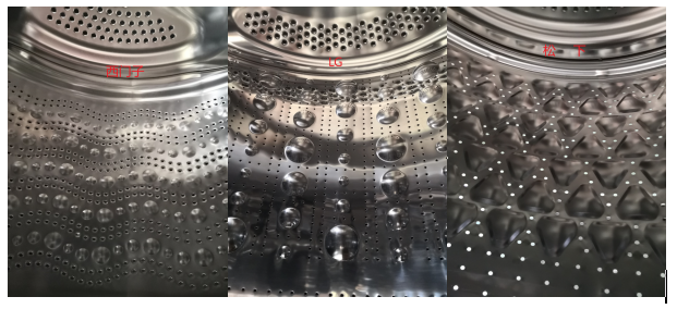 三臺洗衣機使用的都是全鋼內筒,不同品牌的內筒大同小異,差別主要在內筒紋路和有效容積上。