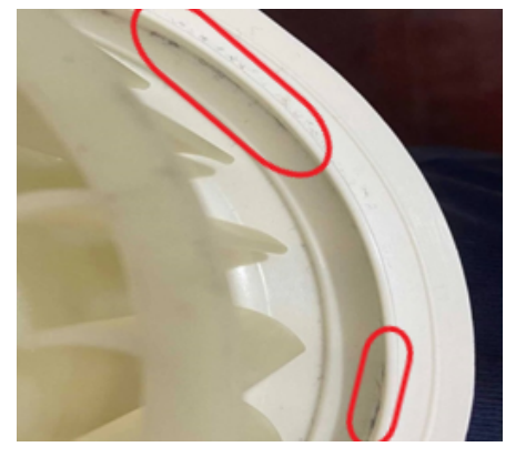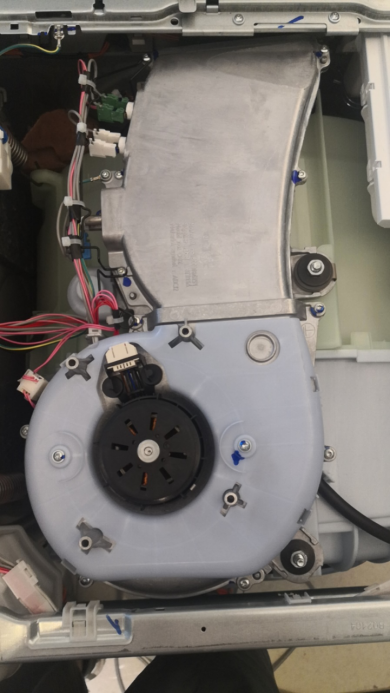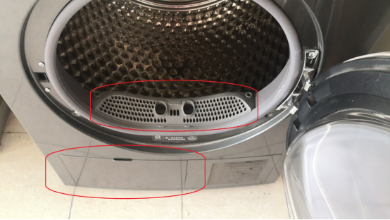 上圖是洗烘一體機烘干3次床上四件套后,電機口絨毛堆積情況。可以明顯看紅圈處絨毛已經有堆積的苗頭。惠而浦等少量的洗烘一體機會把烘干風道做成光滑平面,有的品牌還會想辦法改變結構以求加裝上毛屑收集器,這些設計都可以延緩毛絮的堆積。不過很可惜,本次測試的三臺洗烘一體機均沒有以上設計。