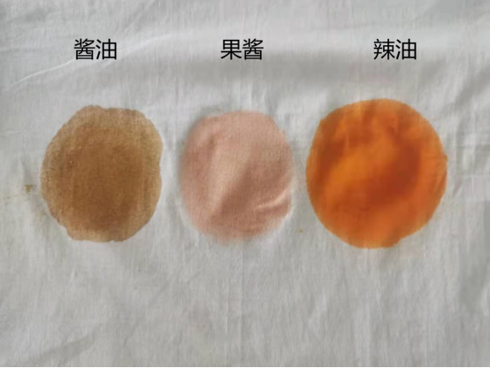 首先,用滴管分別取5mL的醬油、果醬、老干媽辣油對白色T恤進行污染。將污染后的T恤搭配冬季外套1件、冬季外褲2件一起洗滌。三臺洗衣機的程序都選擇“強力洗+40℃水”。