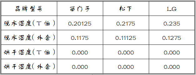 三臺洗衣機在脫水階段都是采用的1400轉的脫水轉速,因為衣物材質的差異,棉質的T恤含水量較高,化纖的外套和外褲含水量較小,品牌之間脫水濕度的差異對最終烘干濕度影響比較小,只是會影響烘干的時間和能耗(這一點在測試7中有反映)。