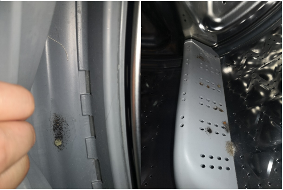 如果會有較長時間不使用洗衣機,在運行完筒自潔等類似程序后,一定要用干凈不脫毛的毛巾將洗衣機皮圈和內筒中殘留的毛屑擦拭干凈,并把門打開透氣,否則就是上圖的模樣——松下LD166筒自潔后,12天沒有使用洗衣機,內部開始出現明顯霉斑。
