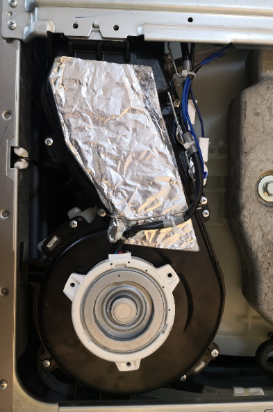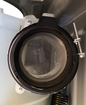 上圖是松下的絨毛過濾網,安裝在筒和風機的連接處(靠上),主要是防止烘干過程中產生的絨毛被吸入到風機中,最新一代的松下機型還在這里加裝了獨立水路和高壓噴頭,能夠對蓄積在這里的毛屑進行沖洗。