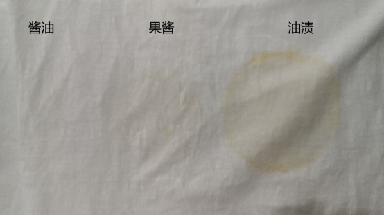 洗滌完后自然風干,僅從圖片可以看到辣油殘留比較明顯,果醬稍有殘留(圖片壓縮后很難觀察到),醬油漬基本洗凈。