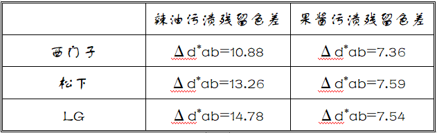 在“白度ASTM”標準下,以f6f4f1為標準色(T恤顏色和標準色之間的色差值為Δd*ab=6.7,測量的色差越接近6.7,洗凈能力越強),測得三臺合資洗衣機的色差如下: