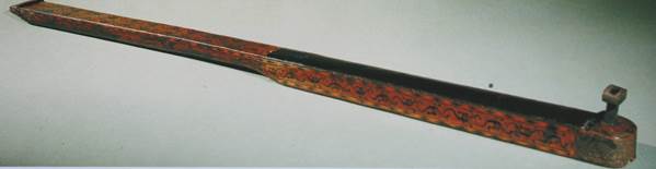曾侯乙墓中一共出土了120多件樂器,其中一件比較特殊:它出自東室,形若長棒,由整木雕成,首段近方,尾段近圓。通長115厘米,面寬5.5–7厘米,表面平直狹長。方形首端中空似音箱,圓形尾端實木實心類似木柄。器身通體黑漆為地,以朱、黃兩色相間描繪出各種紋飾。首端立一蘑菇狀柱,以供拴弦之用。弦已朽爛無存,但從柄端并列的5個弦孔判斷,此器應有五根絲弦(圖1)。