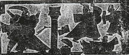 其二,“太子及賓客知其事者,皆白衣冠以送之。至易水之上,即祖(阻),取道,高漸離擊筑,荊軻和而歌,為變徵之聲,士皆垂淚涕泣。又前而為歌曰:‘風蕭蕭兮易水寒,壯士一去兮不復還!’復為羽聲忼慨,士皆瞋(chēn,音郴)目,發皆上指冠。于是荊軻就車而去,終已不顧。”圖7為漢畫像石《荊軻刺秦王》(圖7)。
