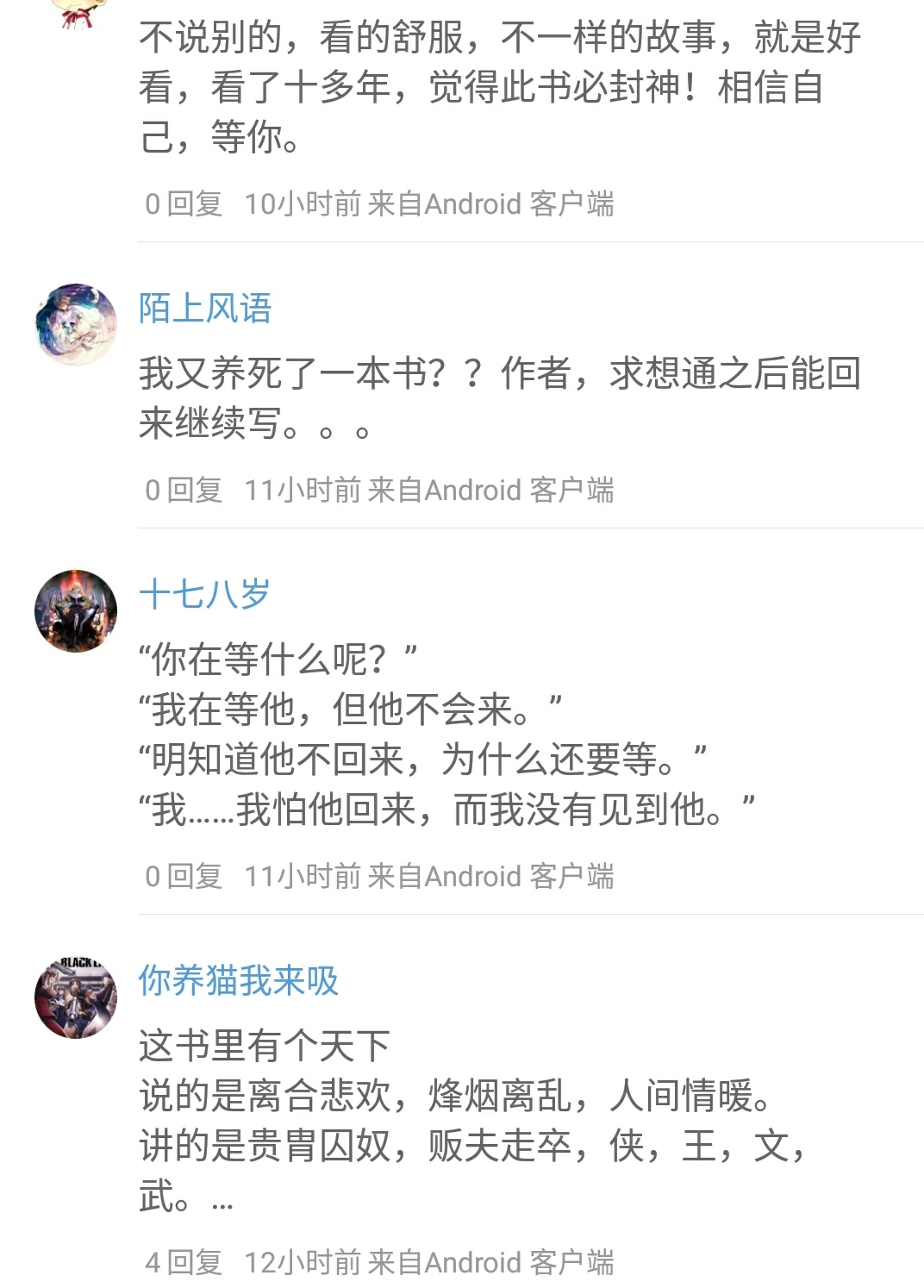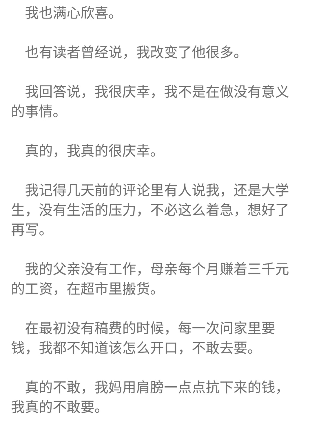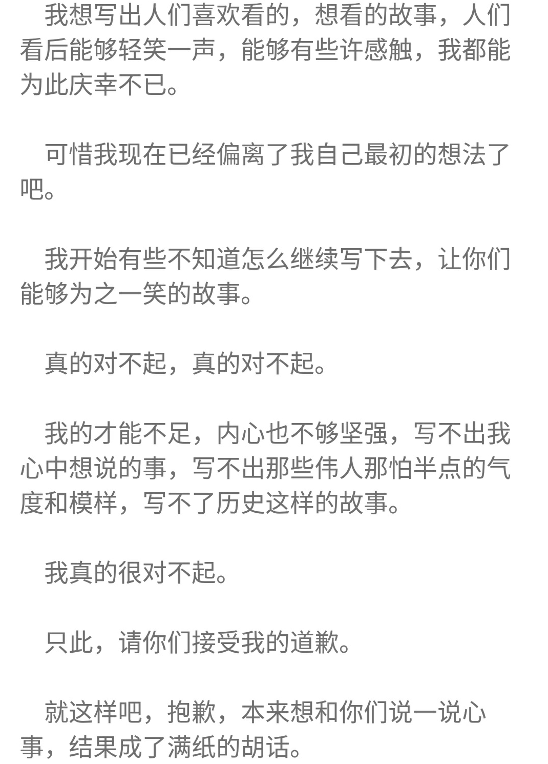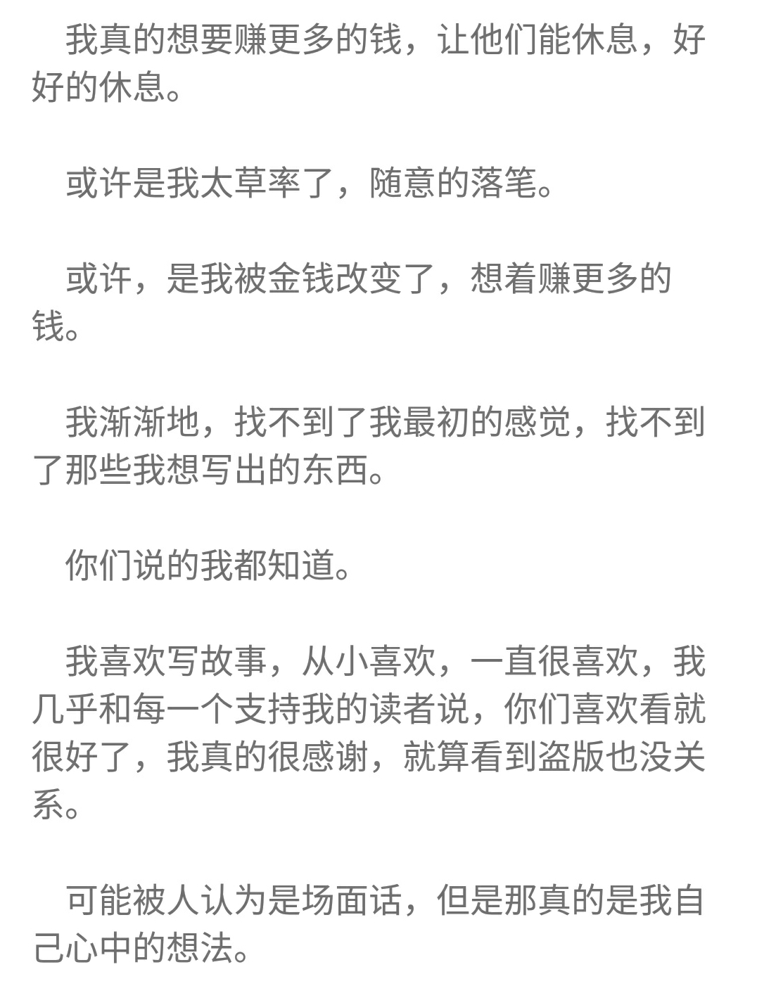 但我更佩服他做的這個決定,換位思考,我做不到,大部分人都做不到,已經有這樣的底子了,就算后面寫不好,隨便水一水,躺著也能賺錢。但他卻拒絕這樣的平庸,我想他是真正喜歡寫作,真正喜歡自己的作品,真正的為書友著想。