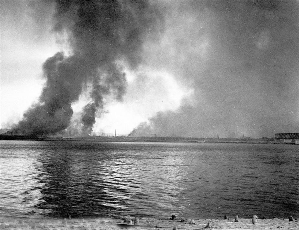 1950年10月初,侵略軍悍然越過三八線,并把戰火燒到中國邊境。圖為安東市(今遼寧省丹東市)對岸朝鮮新義州在濃煙烈火中。新華社發(楊振亞 攝)