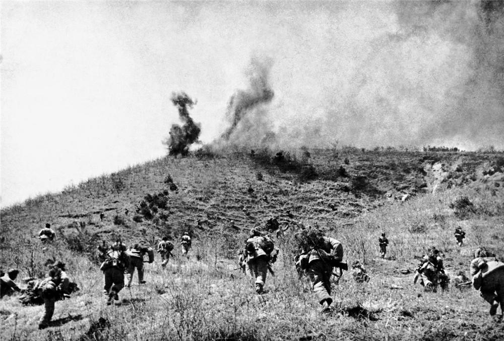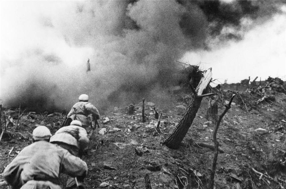 1952年,在上甘嶺戰役中,中國人民志愿軍指戰員在炮火支援下,攻上537.7高地北山。新華社發