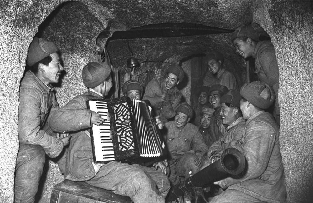 在朝鮮前線,雖然戰斗激烈,生活艱苦,但中國人民志愿軍戰士始終保持著革命樂觀主義精神。這是戰斗間隙,坑道里的中國人民志愿軍戰士歌聲、笑聲不斷(1952年攝)。新華社發(葛力群 攝)