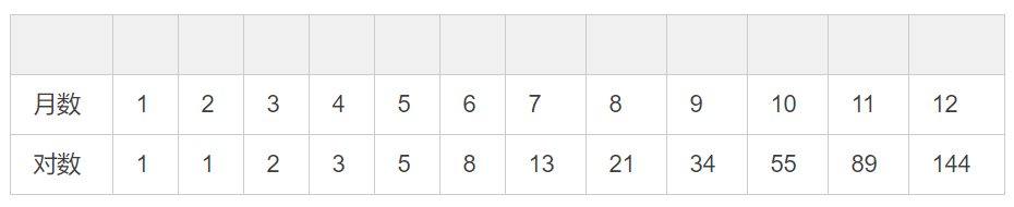 斐波那契數列可以用來描述兔子繁殖問題,一般而言,兔子在出生兩個月后就有繁殖能力,一對兔子每個月能生出一對小兔子。如果所有兔子都不死,那么一年后可以繁殖多少對兔子?實際結果如下,第一個月和第二個月,兔子還沒有繁殖能力,所以都只有1對。第三個月生下第一對,總共有2對。第四個月老兔子繼續生下一對,另一對還沒有繁殖能力,總共有3對。以此類推,第五個月到第十二個月的兔子對數對應如下。