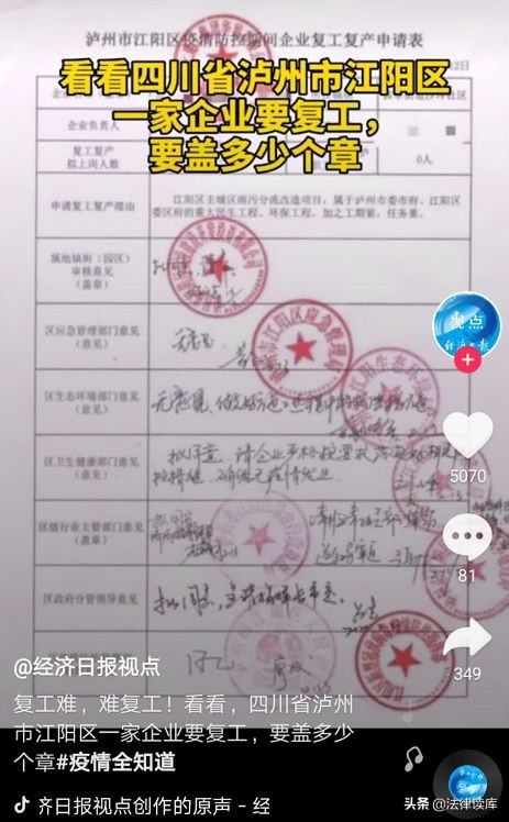 抖音上就曬出了四川瀘州一家企業復工要蓋多少個章!你說這些蓋章的單位真的了解企業和員工的真實情況嗎?