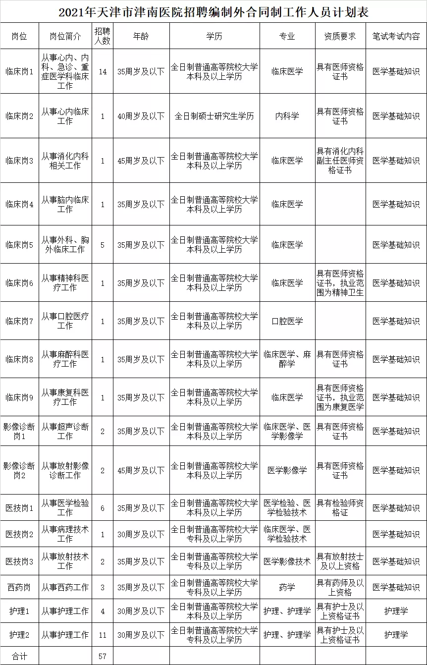詳見《2021年天津市津南醫院招聘編制外合同制工作人員計劃表》