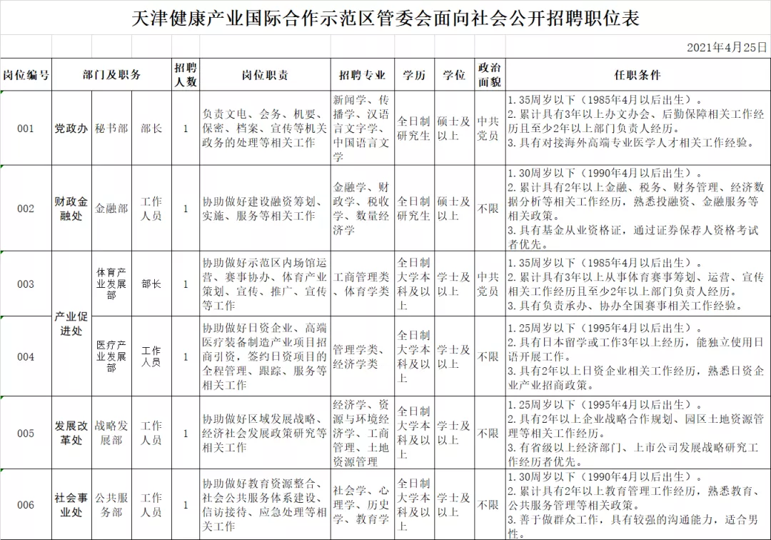 根據工作需要,擬面向社會公開招聘內設機構工作人員6名,其中,部長2名,工作人員4名。(詳見《天津健康產業國際合作示范區面向社會公開招聘職位表》)