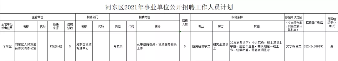 為滿足河東區部分事業單位補充工作人員的需要,根據《天津市事業單位公開招聘人員實施辦法(試行)》(津人社局發〔2011〕10號)、《市委組織部市人力社保局關于進一步完善事業單位公開招聘工作的通知》(津人社局發〔2017〕37號)文件及相關規定,計劃面向社會公開招聘專業技術崗位工作人員5名。現將有關事項公告如下: