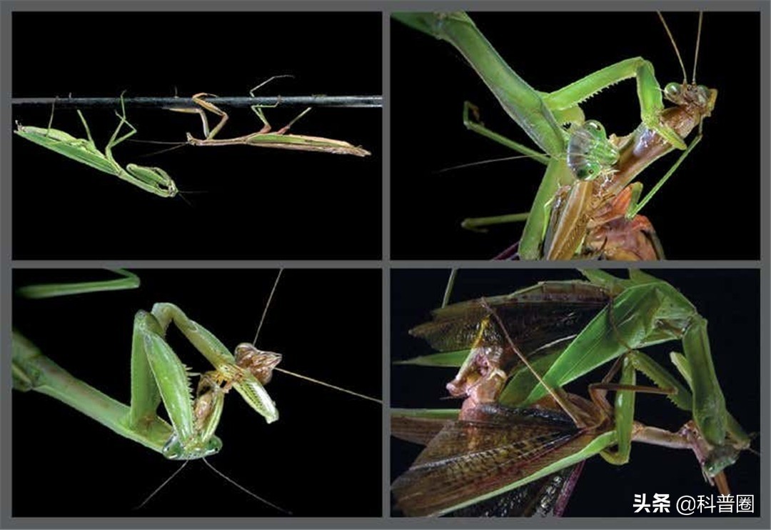 科學家觀察到野生螳螂的交配行為,發現雄性大多時候是悄悄靠近雌性,之后迅速跳到對方背上交配,完成交配后飛快逃走。