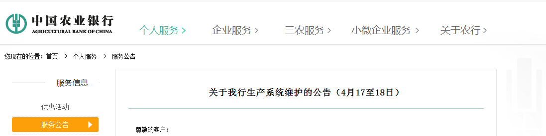 中國農業銀行:關于我行生產系統維護的公告(4月17至18日)