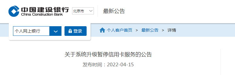 中國建設銀行:關于系統升級暫停信用卡服務的公告