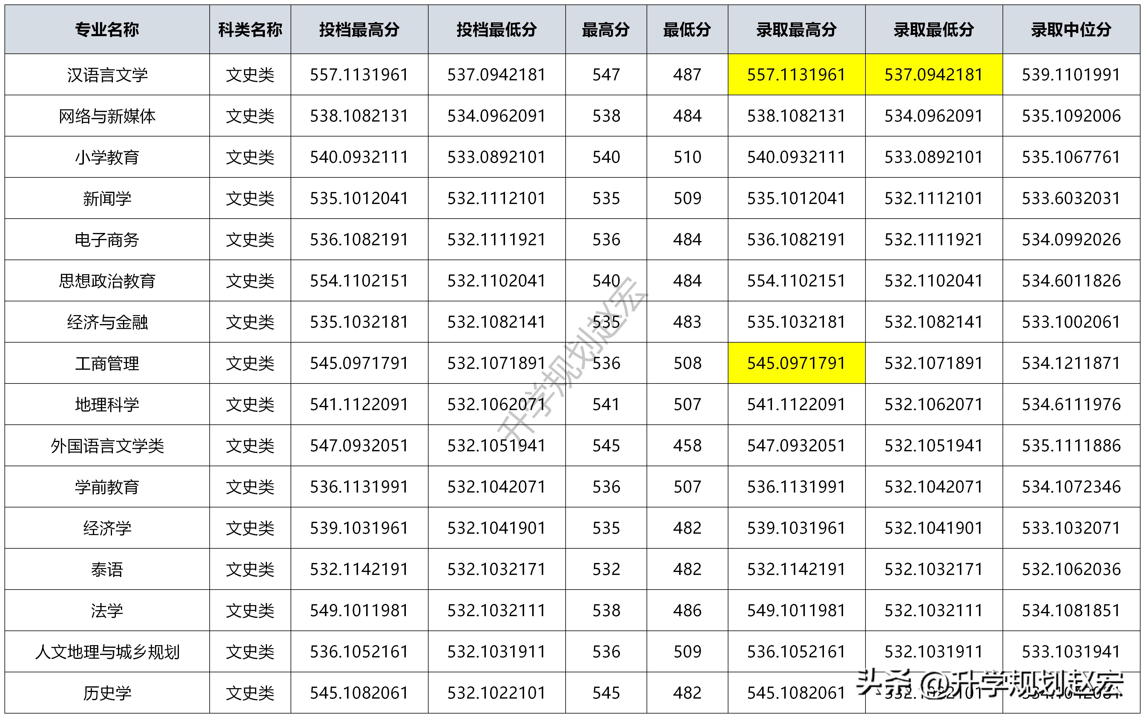 再來看看文科,調檔線最高的是漢語言文學537分,錄取最高分也是該專業557分,排前面的大多都是師范熱門,但還是有亂的情況。理科和文科的各個專業之間的橫向和縱向比較都還算合理,但是要注意“專業優先”的錄取規則,這就意味著咱們選擇專業的時候,不能全部把第一志愿滿額的專業填到前面,一個錄取不了,前面幾個都錄取不了,這個非常關鍵;沒有標注滿額專業的數據,就用專業三區法去進行分區,上區一定是第一志愿滿額的專業;
