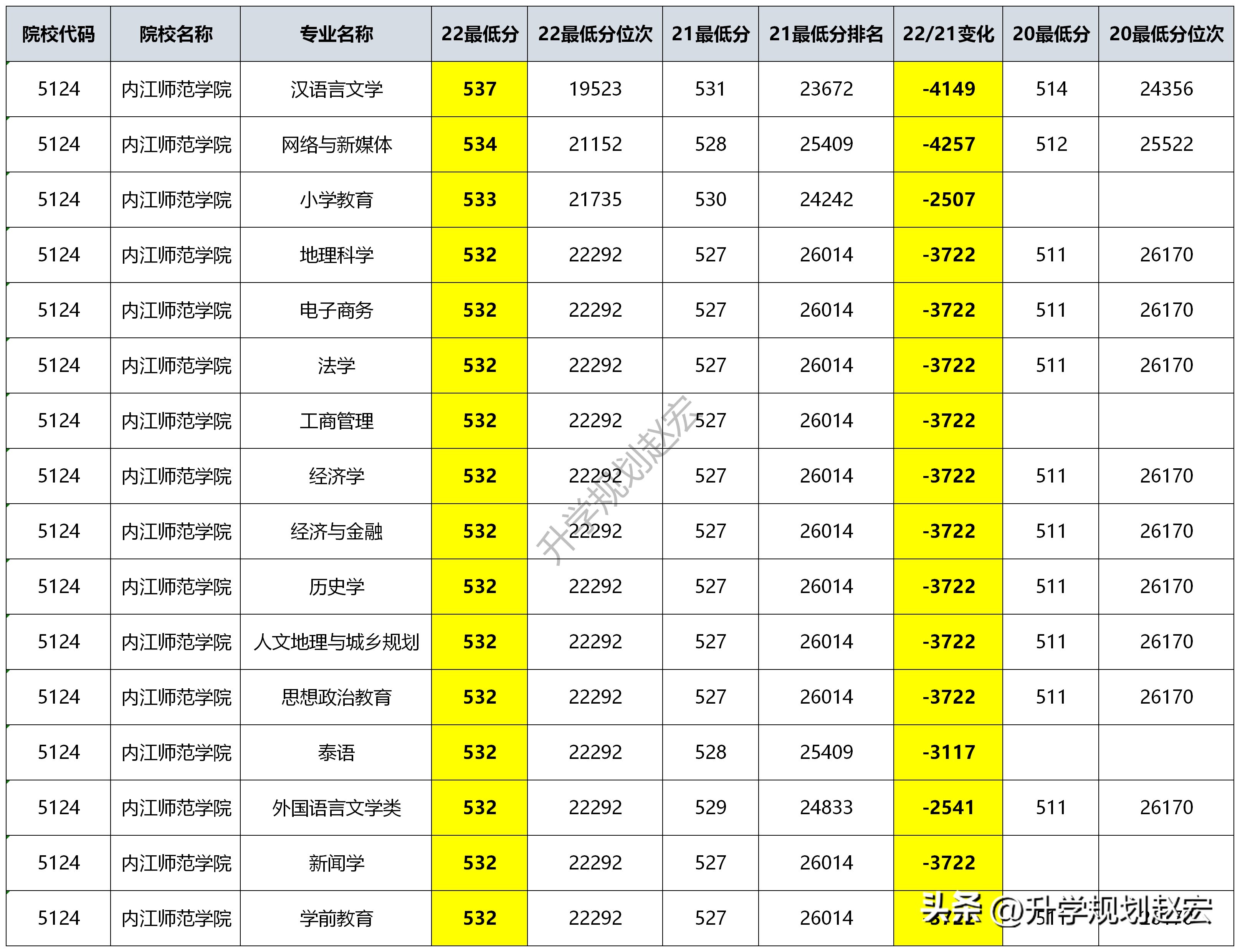 看完2022年的數據后,咱們需要做三年的對比,因為填報的時候關鍵點也是在這兒,如果不是很確信的時候,那咱們就用平均分來參考,浪費一點也是沒多大問題。從位次對比后,位次上漲的最高的是數學與應用數學專業,上漲了13207名,其他專業都上漲在5000多名,或者3000名左右。主要的原因還是來源于招生計劃的波動。2021年的擴招,2022年的縮招。