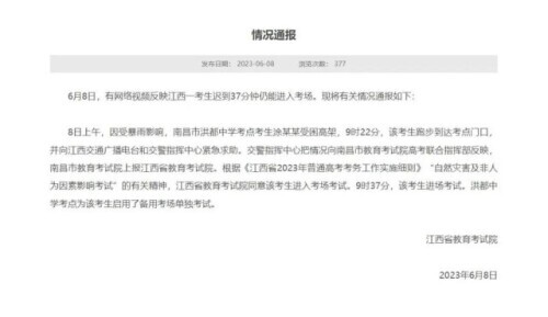 8日上午,因受暴雨影響,南昌市洪都中學考點考生涂某某受困高架,9時22分,該考生跑步到達考點門口,并向江西交通廣播電臺和交警指揮中心緊急求助。交警指揮中心把情況向南昌市教育考試院高考聯合指揮部反映,南昌市教育考試院上報江西省教育考試院。根據《江西省2023年普通高考考務工作實施細則》“自然災害及非人為因素影響考試”的有關精神,江西省教育考試院同意該考生進入考場考試。9時37分,該考生進場考試。洪都中學考點為該考生啟用了備用考場單獨考試。