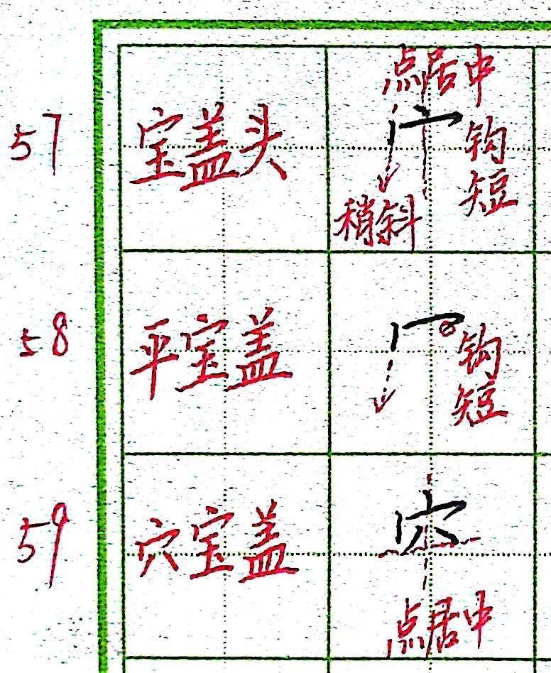 寶蓋頭:點畫的位置可居中,對稱工整。也可以寫在中間偏左一些的地方。第二筆左點稍偏斜下方向,橫鉤的橫畫要長一些,鉤要短。