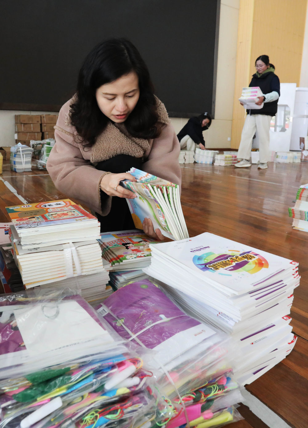 2月1日,江蘇蘇州東中市實驗小學校的老師在整理新書。新華社發(杭興微攝)