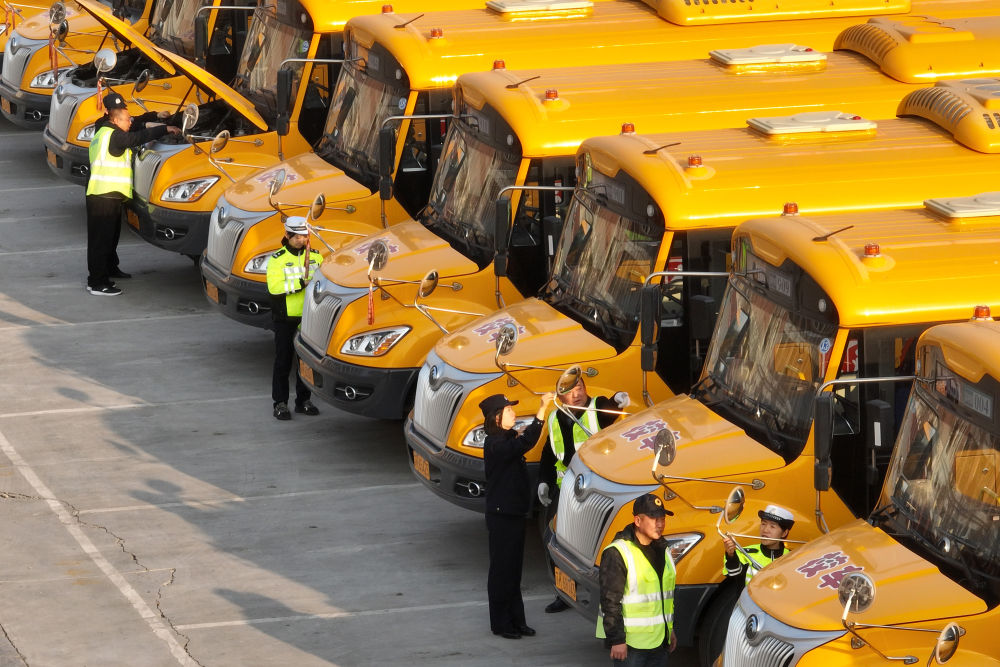 2月1日,江蘇省揚州市寶應縣公安局的交警對轄區校車進行檢查(無人機照片)。新華社發(沈冬兵攝)