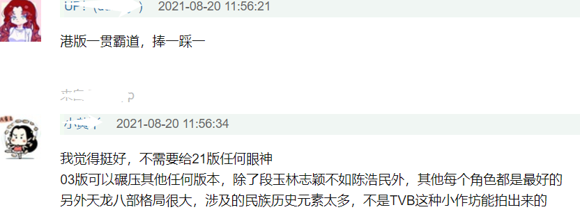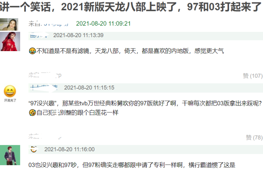 特別是針對97黃日華版本布景粗制濫造、魔改原著等問題,03胡軍版本的粉絲那是相當有話說,直言《天龍八部》原著格局很大,涉及歷史元素太多,不是TVB這種小作坊能拍出來的,就這一點,張紀中拍攝的03版《天龍》可以碾壓其他任何一個版本,并且指出港版粉絲一貫霸道,總是踩一捧一,這次他們要反抗了。