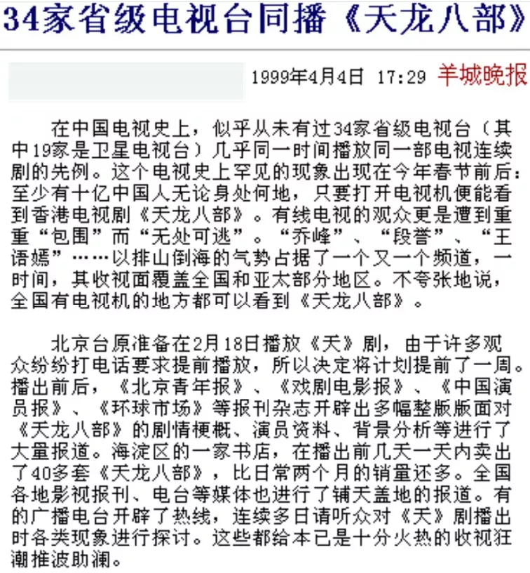報道顯示,1999年34家省級電視臺幾乎在同一時間播放了黃日華版本的《天龍八部》,有電視機的地方就能看到這部劇,北京衛視沒跟上節奏,還被觀眾打電話要求提前播放,劇集播放還帶動了原著銷量,一天就能賣出40多套。