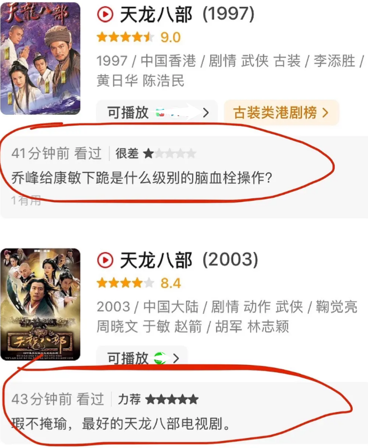 “黃日華”代表著TVB1997年拍攝的港版,“胡軍”代表著張紀中2003年拍攝的內地版,平心而論,雙方各有千秋,可從粉絲反應看,這兩版《天龍八部》可謂積怨已久,口子一開分分鐘“打”到“頭破血流”。