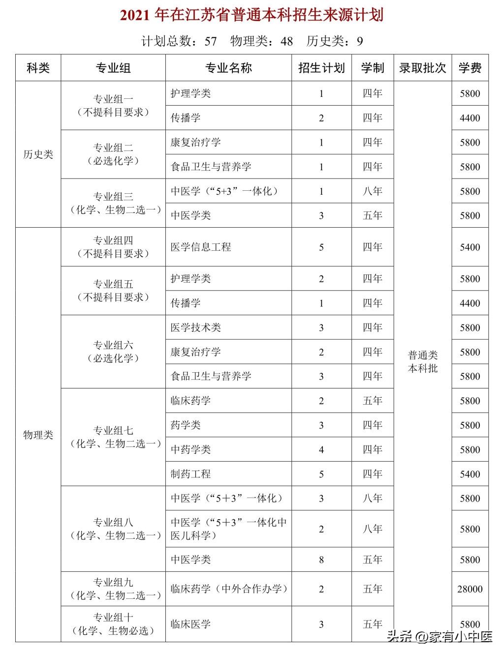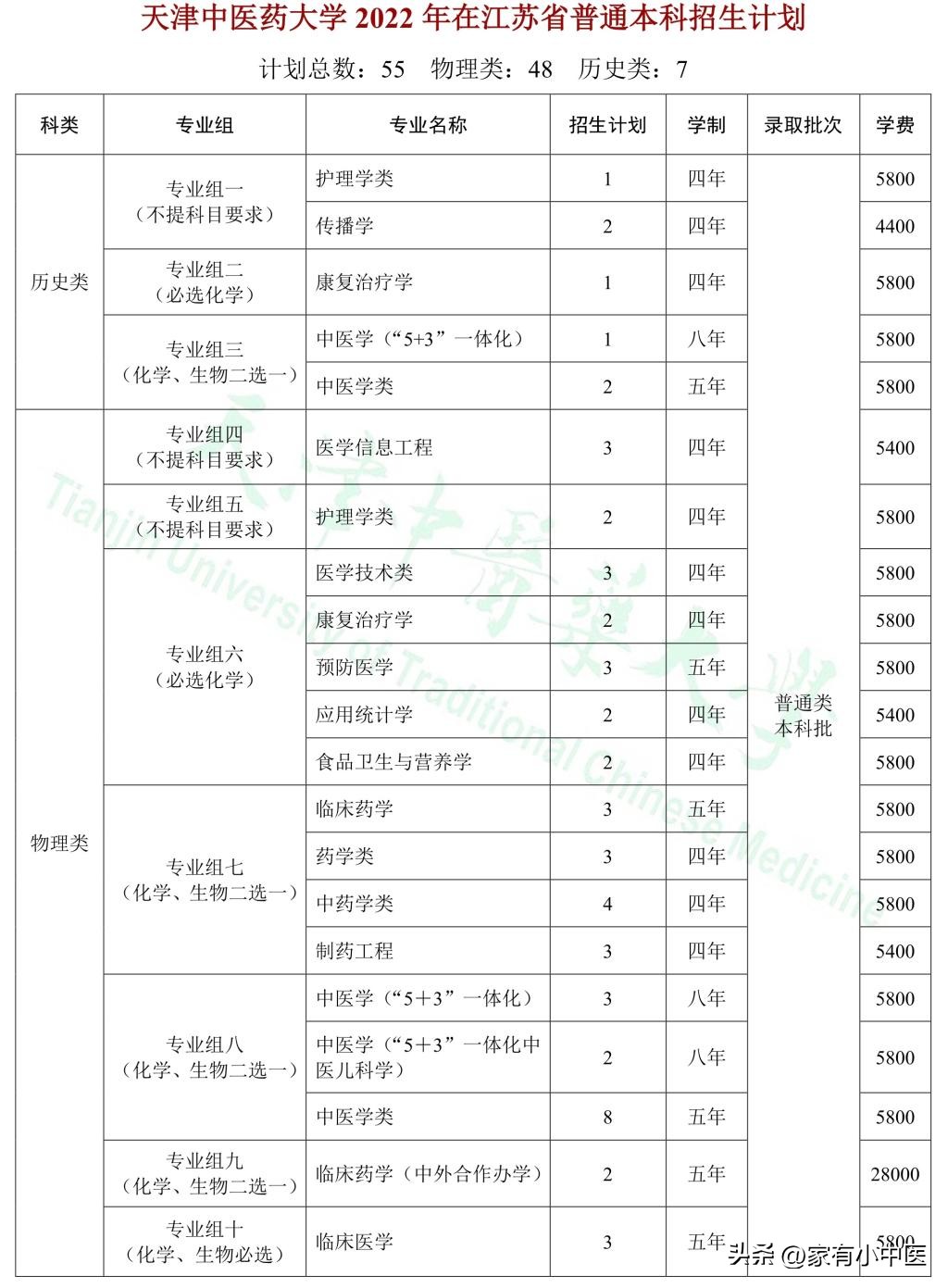 2022年,天津中醫藥大學在江蘇投放招生計劃55個,其中物理類48人,歷史類7人。