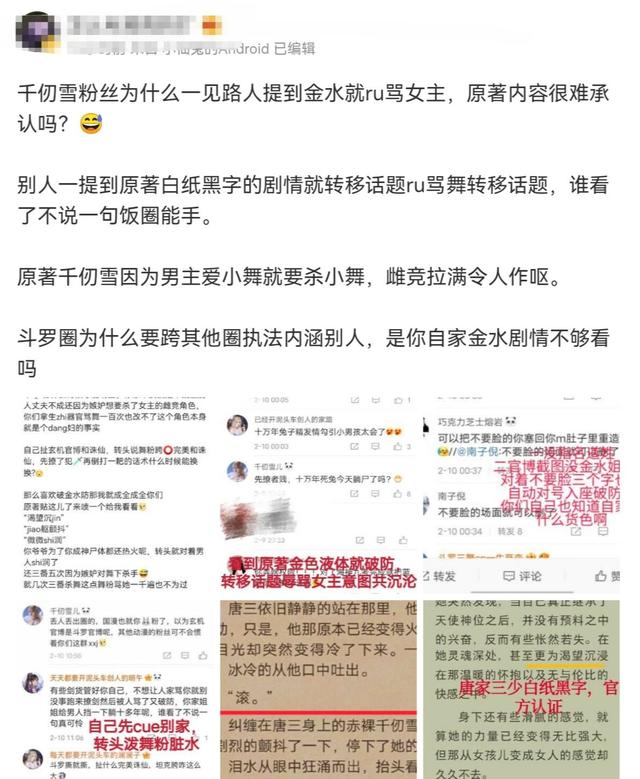 而對于這次粉絲之間互撕情節,最初是有純動畫黨的小舞粉絲引起的,他們知道原著內容后,頓時炸開了鍋,開始和千仞雪粉絲對線,甚至還做出了“對線九宮格”。不過千仞雪的粉絲們也不是吃素的,他們先是罵小舞是“十萬年兔子精”,一邊內涵小舞年紀大,都可以當唐三的太上奶奶了;一邊內涵小舞不是人,甚至嘲諷小舞是妖精勾引男人!于是乎,一場粉絲之間互撕正式爆發,官方也緊急出來關閉了評論區,并將所有不良言論全都清理掉了!