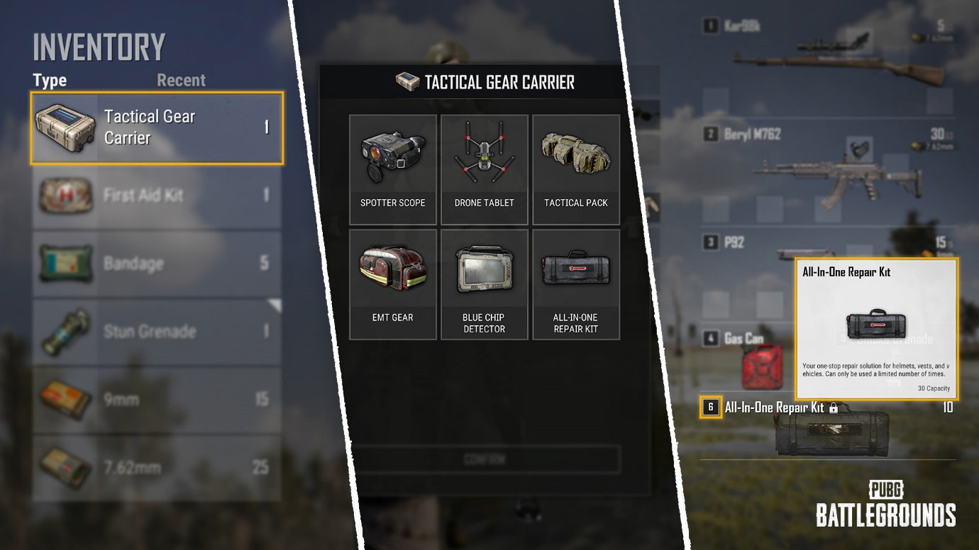 今后在比賽開始時,所有玩家的物品欄中都會出現一個戰術裝備箱。為了確保戰術裝備箱不會在跳傘后對游戲前期的游玩造成負擔,它的重量設為了 0。