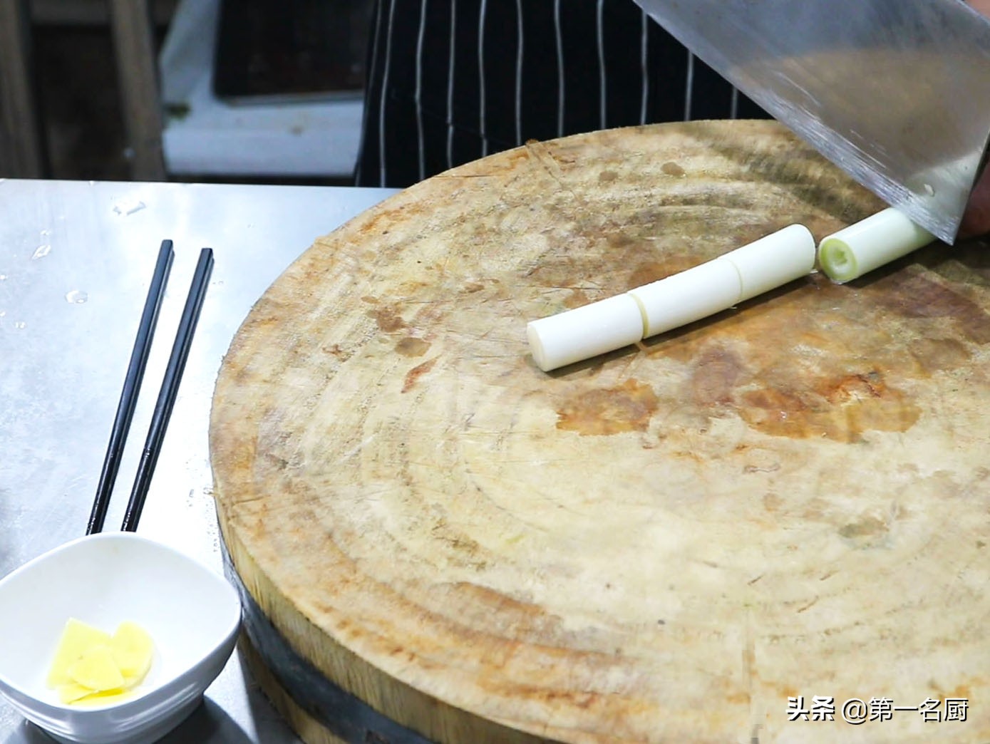 首先準備生姜一塊切成姜片,大蔥半個切成蔥段,放入料碗中備用