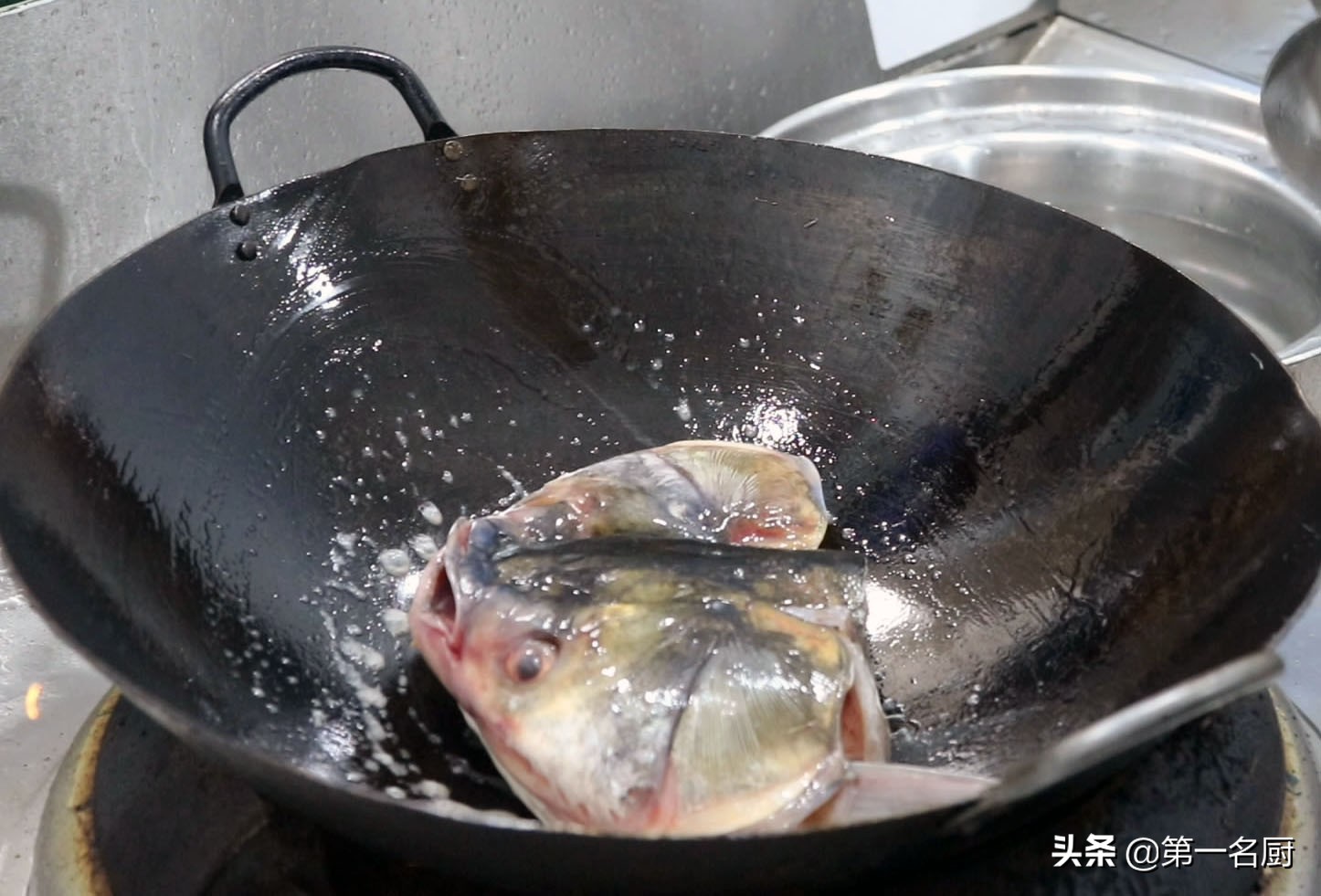 熱鍋倒入涼油,滑鍋后倒出,然后把魚頭朝下放入鍋中,晃動炒鍋慢慢煎制