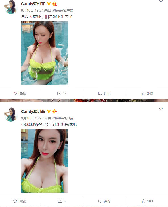 本月9日,龔玥菲連發兩條征婚廣告,分別寫著:“不要彩禮,我老媽給我準備了好多嫁妝”,“中秋節來我家提親吧”...但附上的照片卻還是往常的火辣風格。
