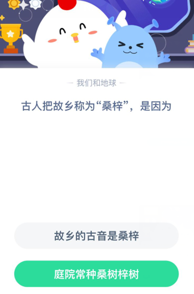 古人把故鄉稱為桑梓是因為3月12日螞蟻莊園每日一題的答案是什么?桑梓就是桑樹和梓樹。古時候,人們常在住宅旁栽種桑樹以養蠶,選對答案的話就可以領取180g小雞飼料了,小伙伴們一起來看看今天的正確答案吧!