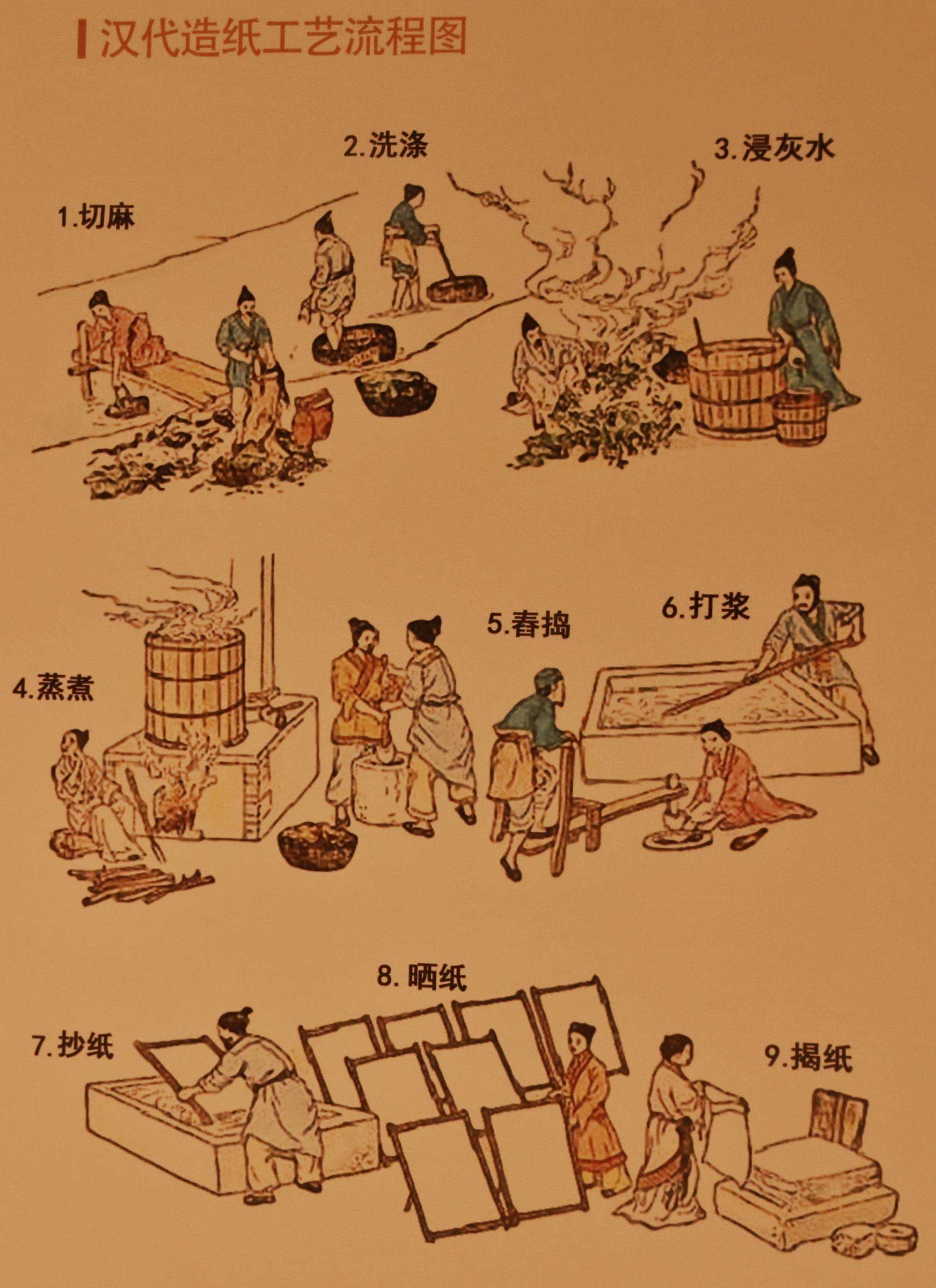 東漢和帝時,曾經領導工匠們為皇帝制造過各種器械的蔡倫,總結了前人造紙的經驗,在105年,以樹皮、麻頭、破布、漁網為原料造紙。這些原料都容易找到,價錢也很低廉,造紙過程比以前更為簡便,能夠大量生產。蔡倫所創造的造紙方法得到了普遍推廣。后來人們又進一步用竹子、蘆葦、稻草、木材等植物的纖維制造出各式各樣的紙,來滿足各種不同的需要。紙的發明和改進,為文化的發展創造了有利條件。