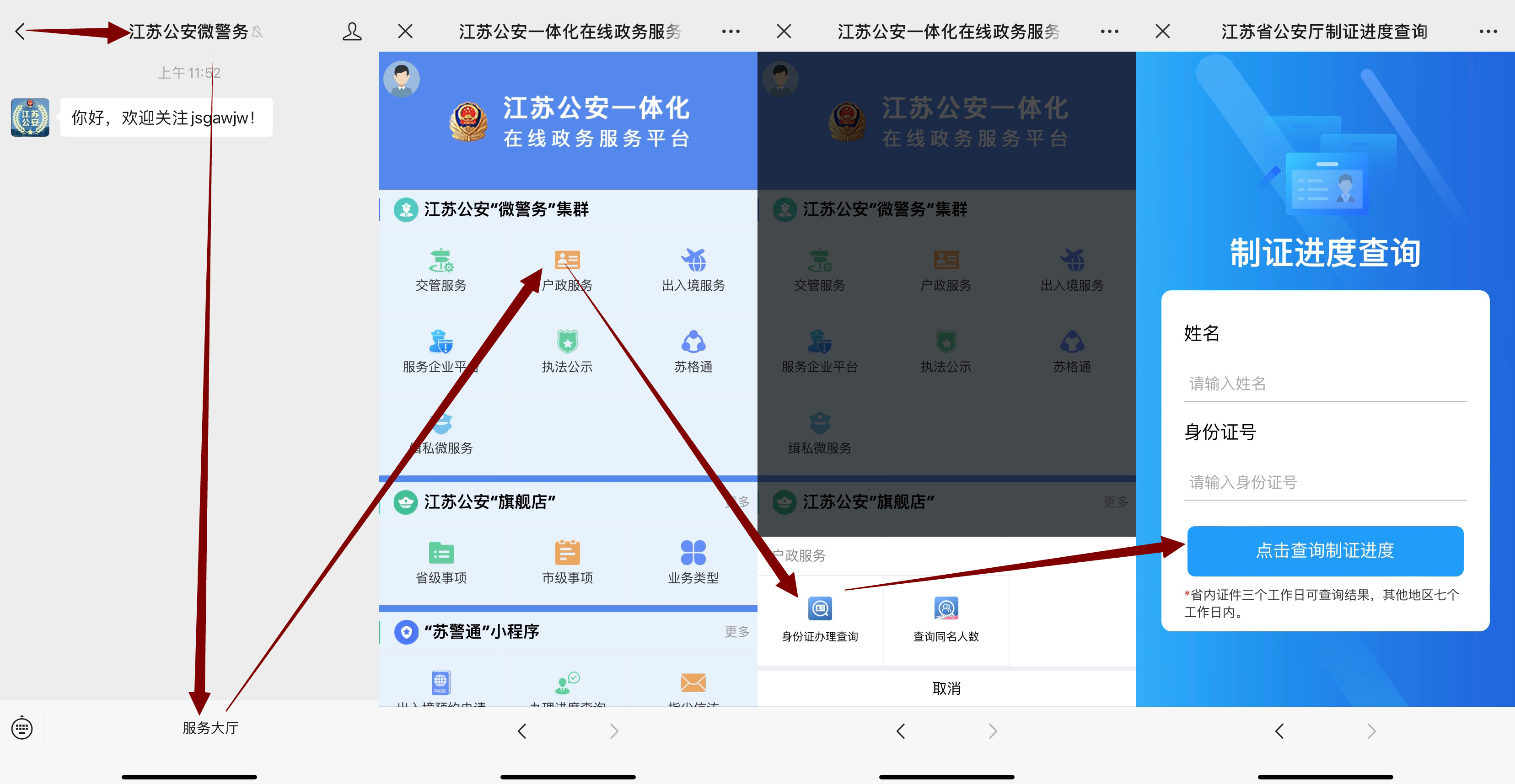 江蘇地區還有身份證辦理進度查詢的服務。可以通過江蘇公安微警務微信公眾號查詢。