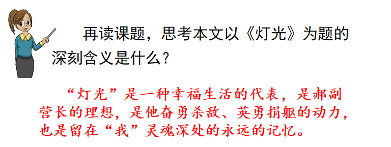 答:天安門前璀璨的燈光,引起了“我”對往事的回憶;郝副營長書上插圖中的燈光,引起了郝副營長對幸福生活的憧憬;正是因為對美好生活的憧憬,促使郝副營長在戰斗中不顧自身安危,點燃了那本書,用微弱的火光為后續部隊照亮了前進的路。