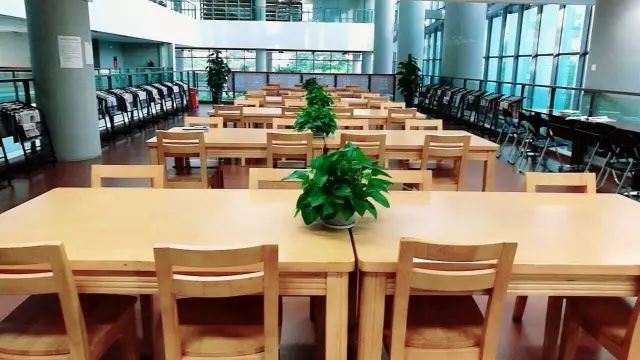 圖書館一樓右側進門有自習室,內有桌椅,空調,插座。圖書館二樓也有一處自習的地方,旁邊有報刊架子,夾著很多的報紙;自習桌子上還擺放著一盆綠綠的小盆栽。
