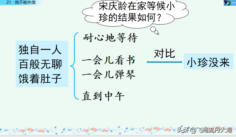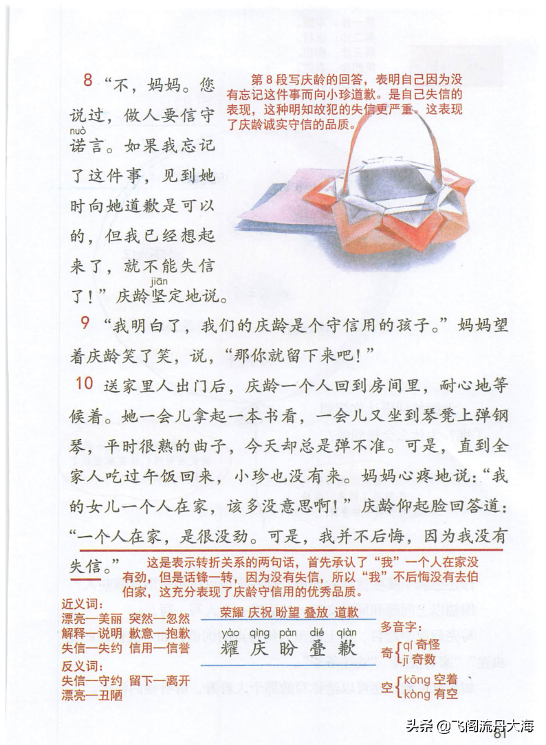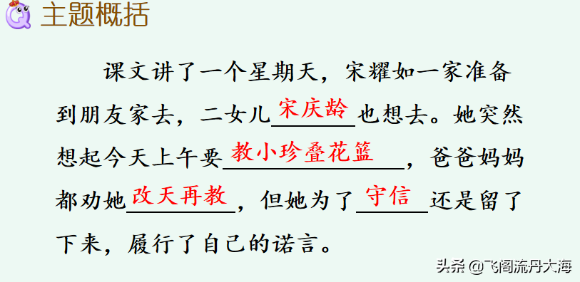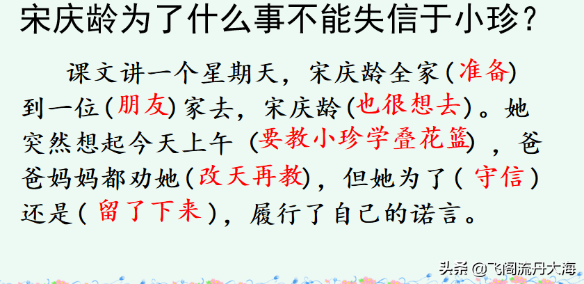 課文講一個星期天,宋耀如一家(準備)到一位(朋友)家去,二女兒宋慶齡(也很想去)。她突然想起(今天上午要教小珍學疊花籃),爸爸媽媽都勸她(改天再教),但她為了(守信)還是(留了下來),履行了自己的諾言。
