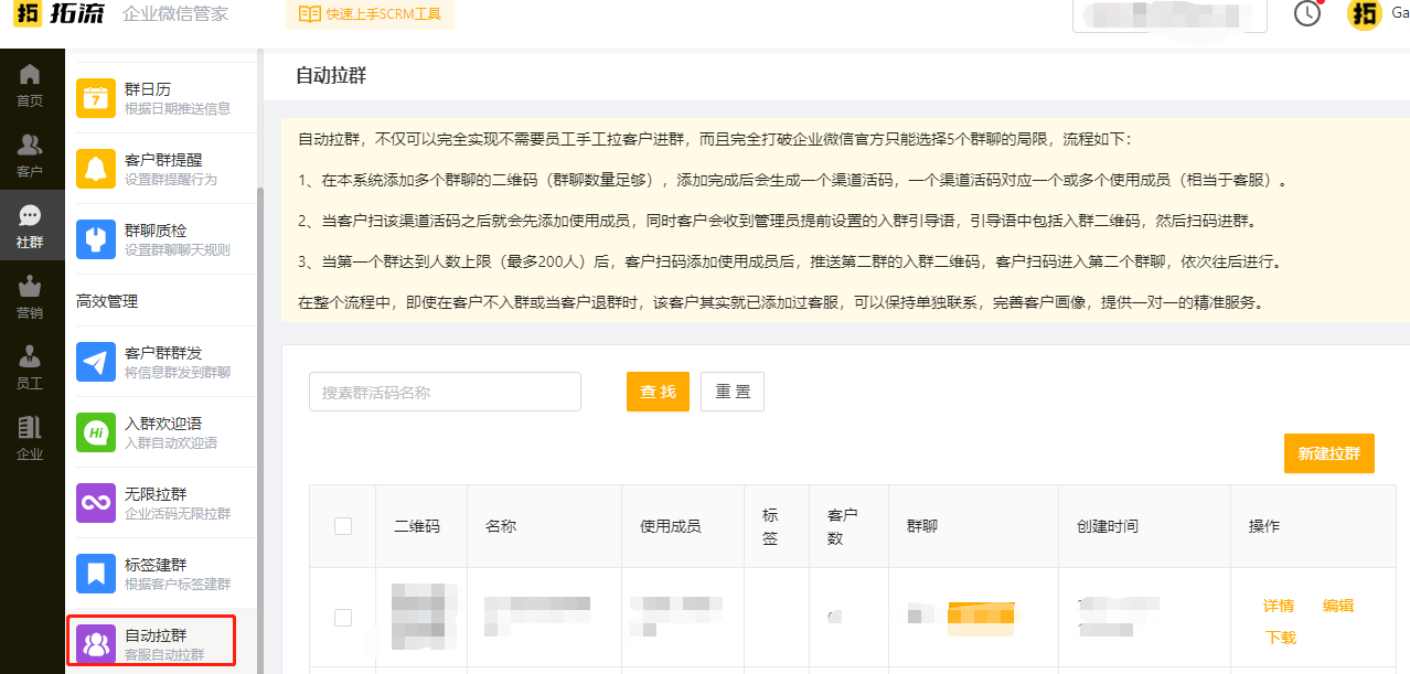 我們可以試試拓流SCRM自動拉群功能,企業微信服務商拓流SCRM針對以上問題,設計了自動拉群功能,能夠滿足大量客戶入群的需求。