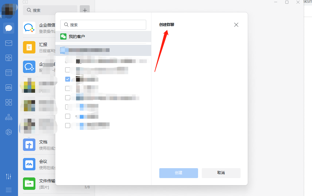第一種是添加客戶進群。點擊企業微信右上角的【+】,再選擇【創建群聊】,就可以將已添加的客戶入群了。